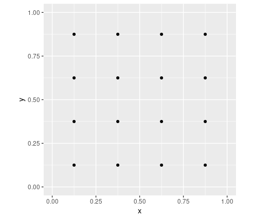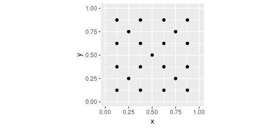 So here, then, is a plot of the (distinct) box centers: One in the middle, for the 9 large boxes, 4 for the 4 * 9 medium-size boxes, and 16 for the 16 * 9 small boxes.