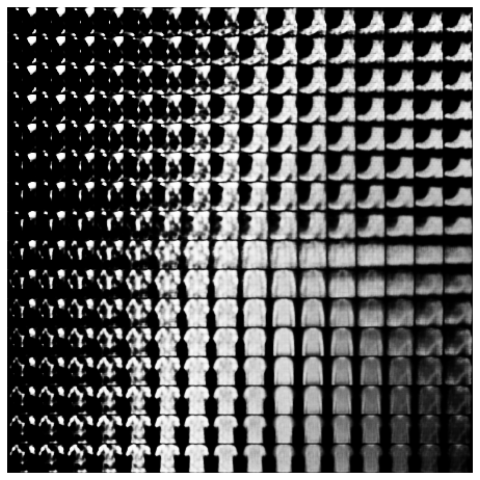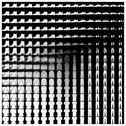 ): generate_random_clothes, used to generate clothes from random samples from the latent space; show_latent_space, that displays the complete test set in latent (2-dimensional, thus easily visualizable) space; and show_grid, that generates clothes according to input values systematically spaced out in a grid.