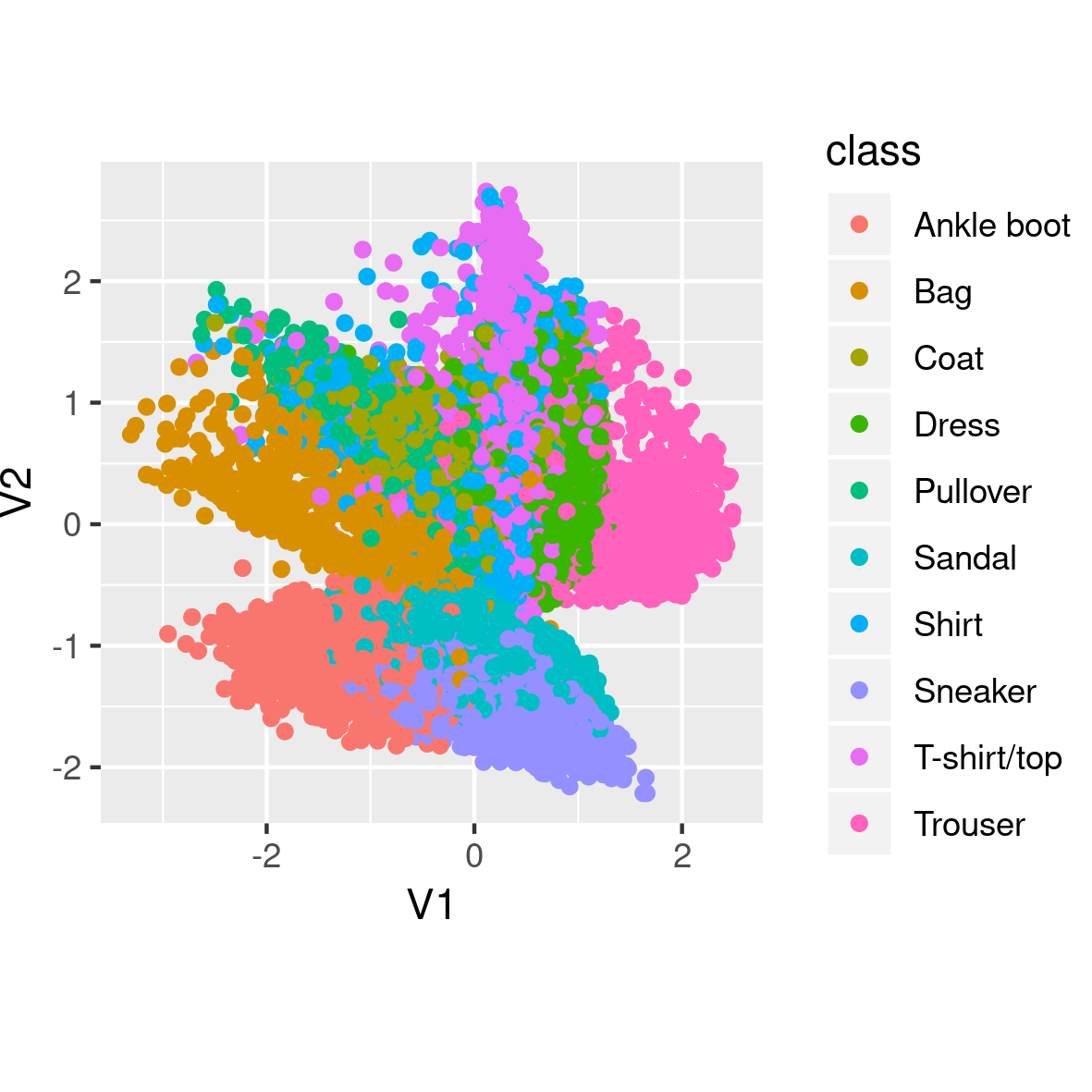 Let’s start training! Actually, before we do that, let’s have a look at what these functions display before any training: Instead of clothes, we see random pixels. Latent space has no structure. And different types of clothes do not cluster together in latent space.