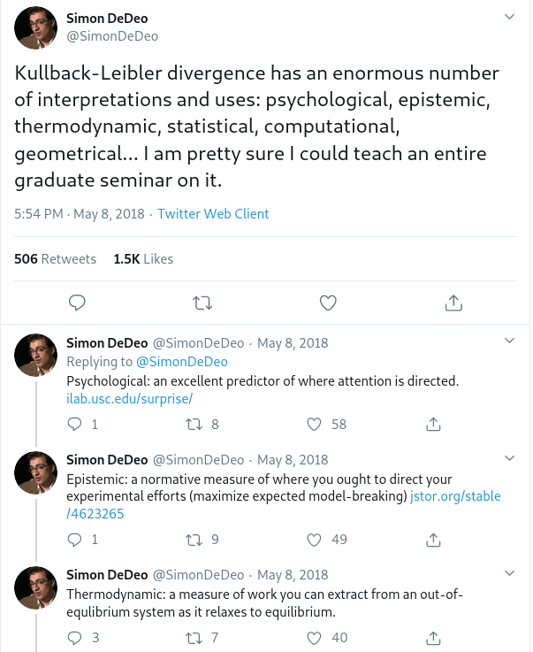 While being inspired by a series of tweets by Simon de Deo, enumerating applications of KL divergence in a vast number of disciplines,