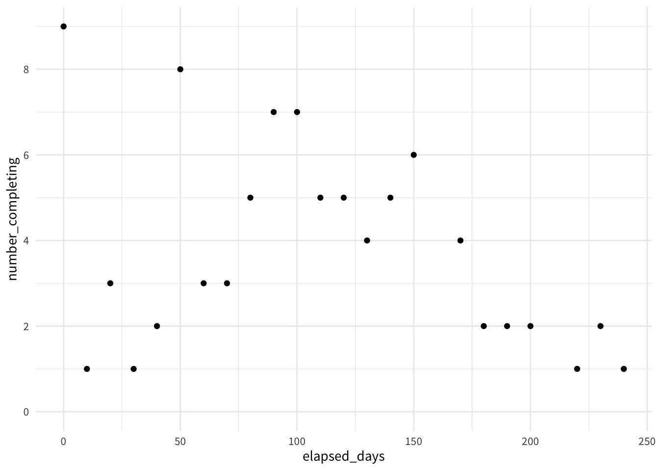Setting aside the first class at rstudio::conf 2019 the overall completion rate seems to be hovering around 45%, and the average time a little over 100 days. We’d like to increase the first figure and lower the second one, but overall we’re pretty happy.