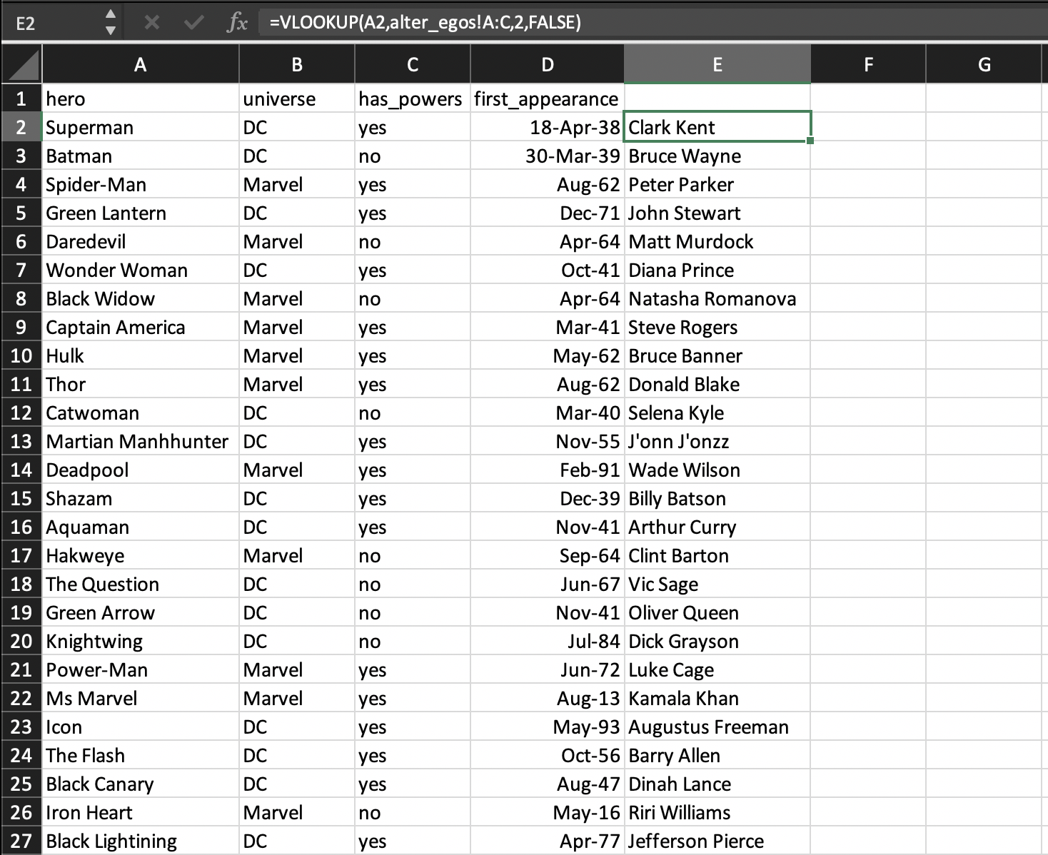 For doing this same task in Excel, we can continue to utilize VLOOKUPS for each additional column of data we want to pull into our main sheet. To bring in our occupation data we simply adjust the initial reference point in our formula from column A2 which houses hero name to E2 which houses alter egos which was also added via a VLOOKUP.