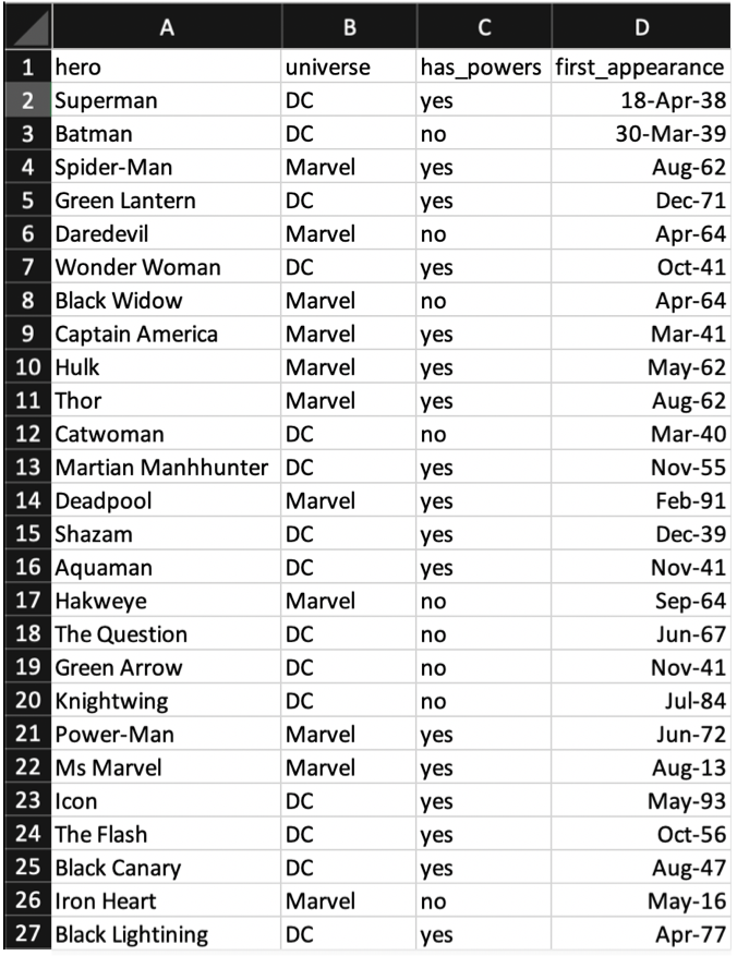 If you would like to follow along, you can download the Excel file called superheroes.xlsx here