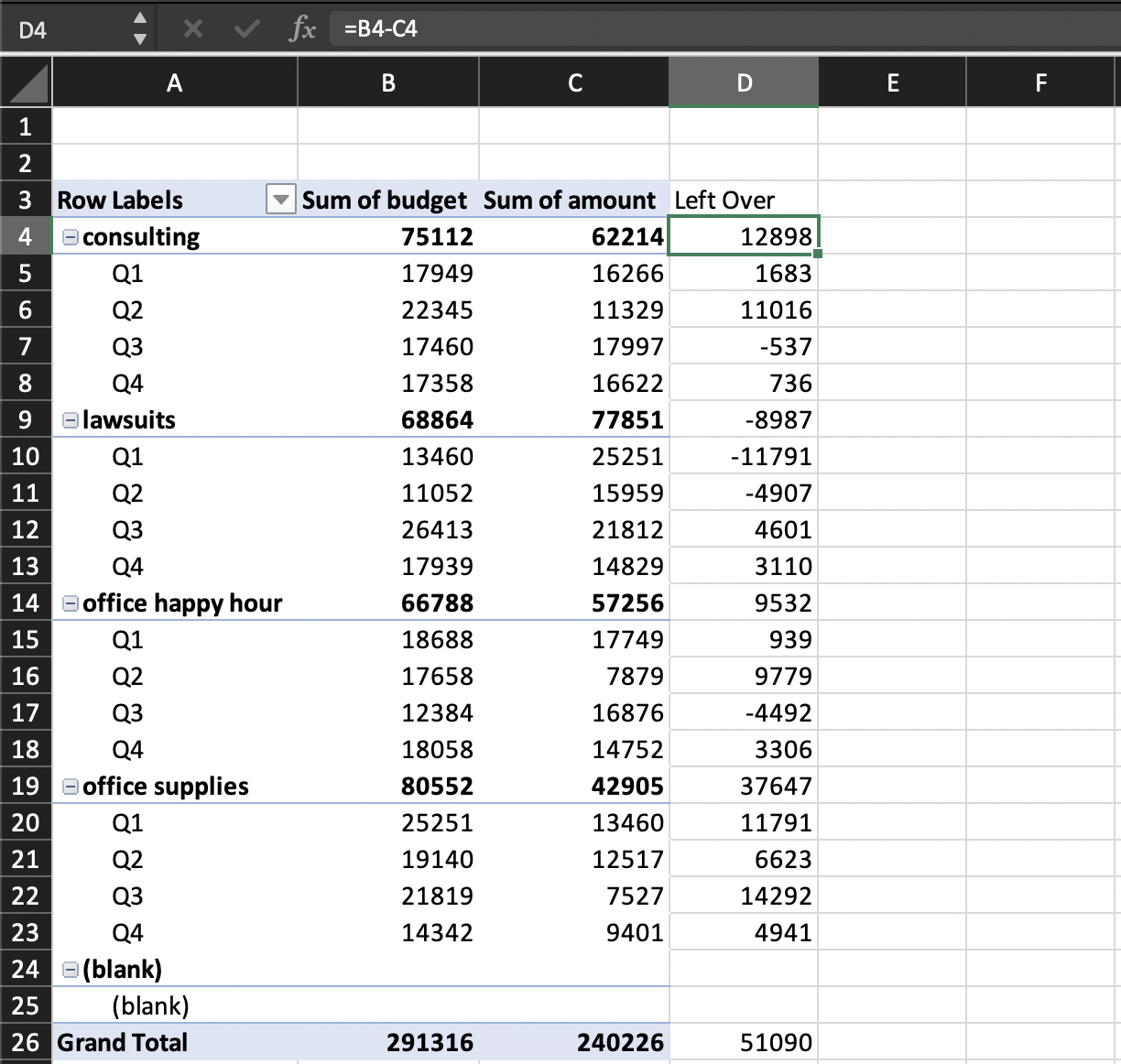 Sometimes we make a table and realize we can use the summary data to create new variables that can better answer our question. Coming back to our finance example, let’s say we want to examine how much money is left over from each quarter based off of budget and amount spent. A quick work around could be to manually add in a formula in a cell adjacent to our table and drag it down to each respective row, a process depicted below.