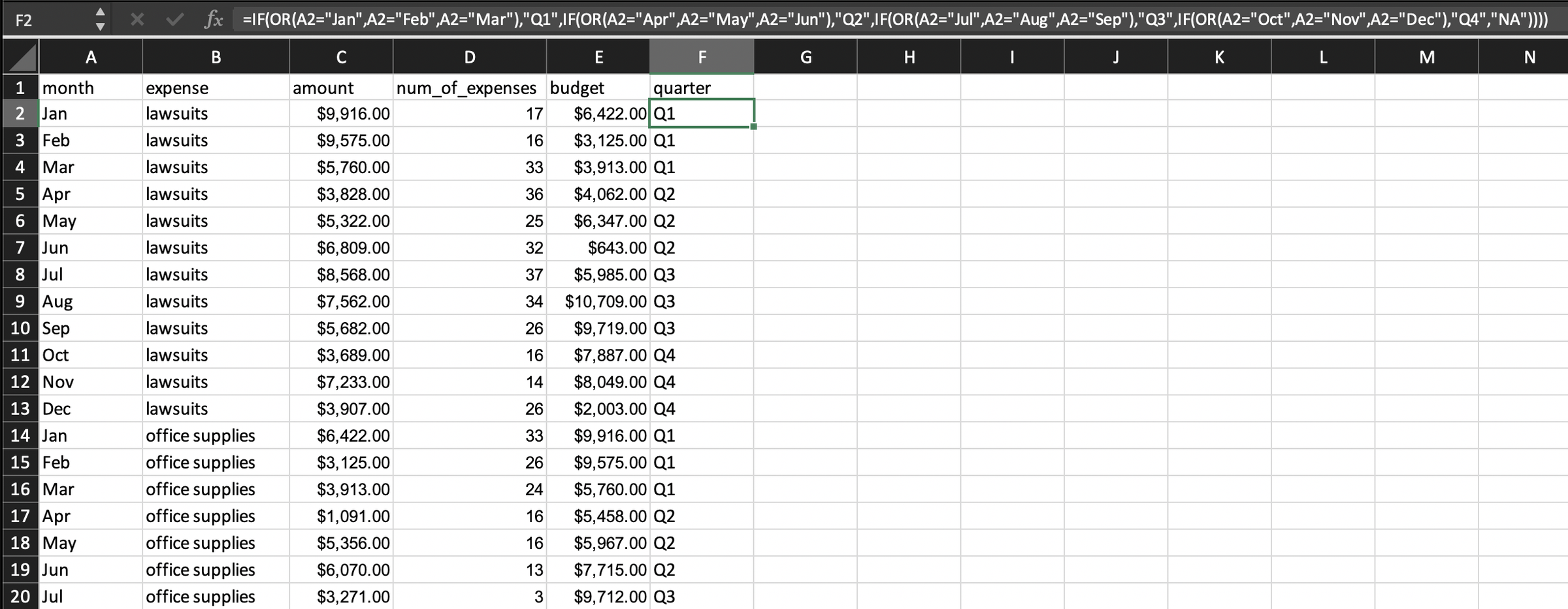 Here we specified which months make up each quarter and as in our spreadsheet formula for good measure added an NA condition in the event we’ve missed something.