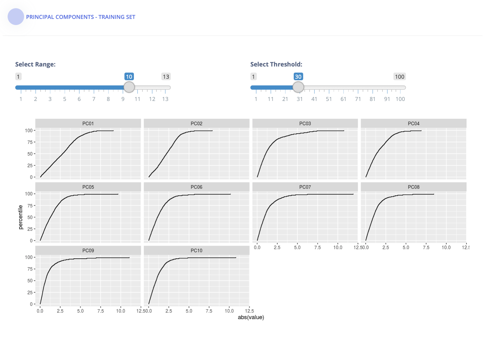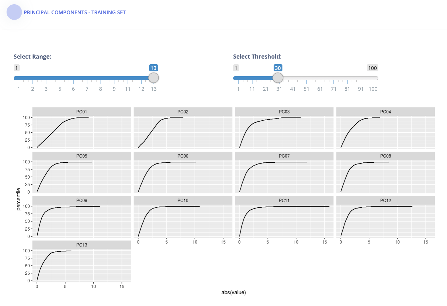 apd_pca: computes the principal components that account for up to either 95% or the providedthresholdof variability. It also computes the percentiles of the principal components and the mean of each principal component.autoplot: plots the distribution function for pcas. You can also provide an optional set ofdplyrselectors, such asdplyr::matches()ordplyr::starts_with(), for selecting which variables should be shown in the plot.score: calculates the principal components of the new data and their percentiles as compared to the training data. The number of principal components computed depends on thethresholdgiven at fit time. It also computes the multivariate distance between each principal component and its mean.