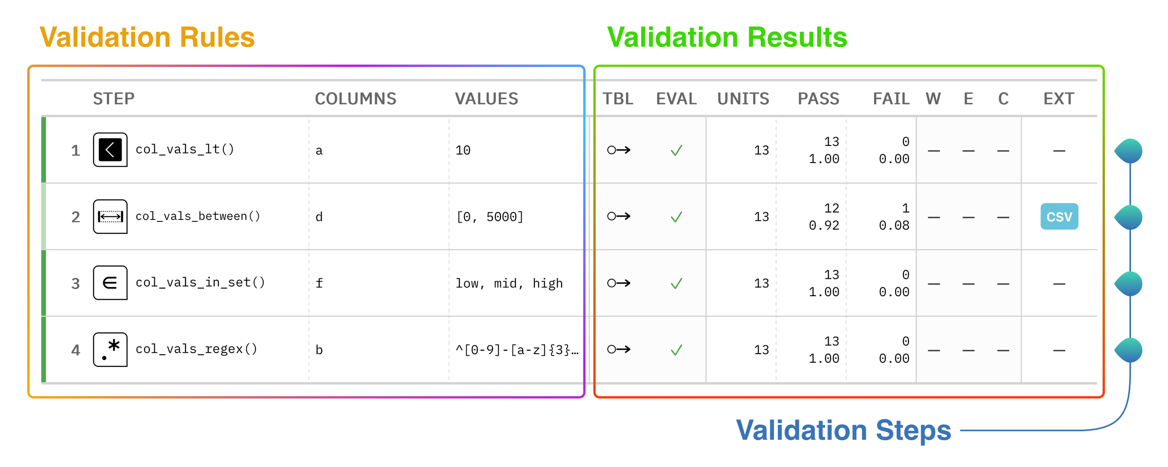 measure of central importance in Pointblank. Each validation step will execute a type of validation