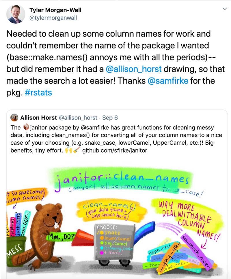 Some of you might know me from my R- and stats-inspired illustrations on twitter ). I’m excited to share that, as of October 2019, I am an Artist-in-Residence with RStudio . My goal as an RStudio Artist-in-Residence is to create useful and engaging illustrations and designs that welcome users to explore, teach, and learn about new packages and functions in R. In this post, I’ll share what motivates me to create R-related artwork, and what I’ll be working on at RStudio.