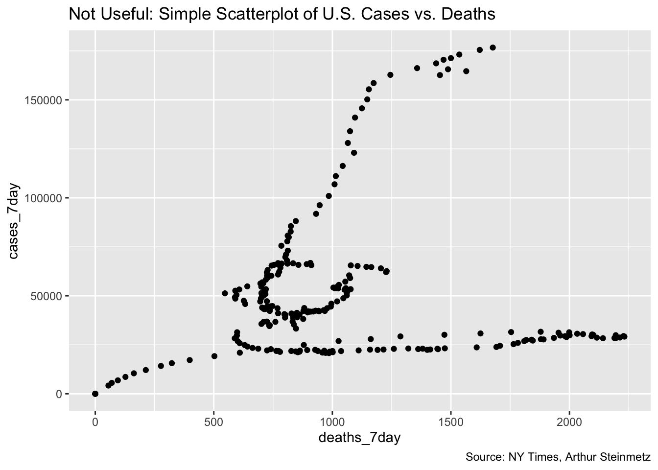 We might be tempted to simply plot deaths vs. cases but a scatter plot shows us that would not be satisfactory. As it turns out, the relationship of cases and deaths is strongly conditioned on date. This reflects the declining mortality rate as we have come to better understand the disease.