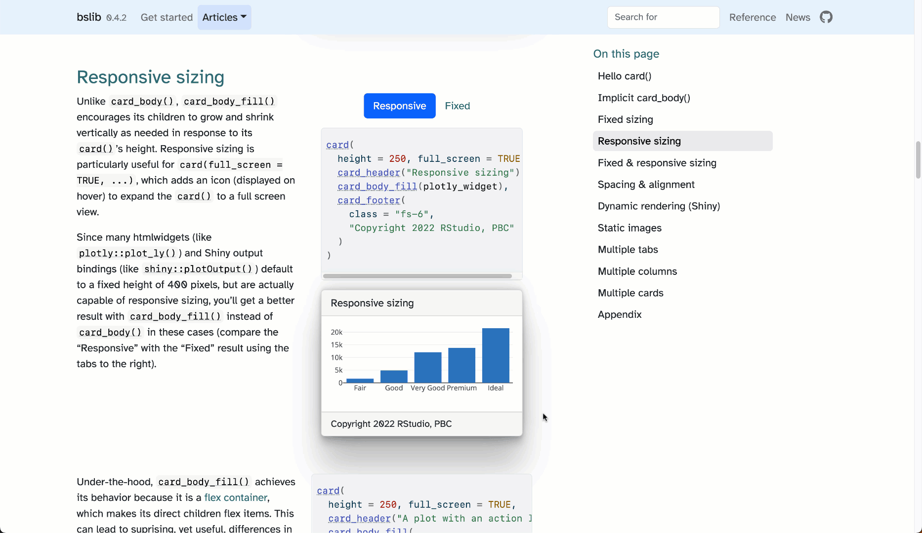 Underneath the hood, cards, value boxes, and layout_column_wrap() all make use of the new bindFillRole() function from {htmltools} (in fact, the newest shiny::plotOutput() and htmlwidgets::shinyWidgetOutput() do as well) to achieve their intelligent responsive fill sizing behavior. We decided to expose the mechanism behind this fill behavior in {htmltools} since it isn't specific to Bootstrap (it's based on CSS flexbox), and as a result, could be leveraged in any Shiny (or RMarkdown/Quarto) project.