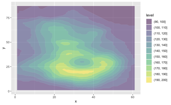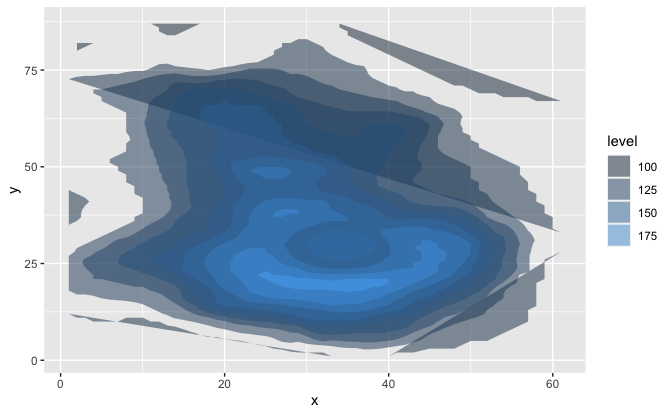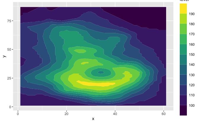 A recurring request has been to allow for filled contours. This has been problematic in the past because stat_density_2d() only calculated the outer contour and didn’t cut out any inner holes or next level contours. This meant that if either the fill was partly transparent, or if the level contained any holes, the output would not be a true representation of the data. For an example of this, we can look at our favorite volcano: