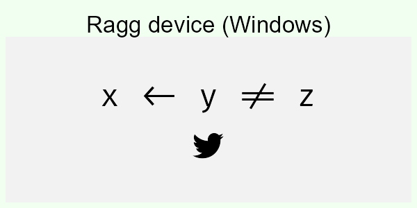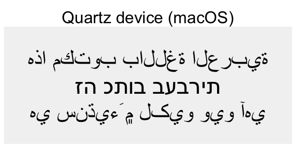 If you’re not familiar with the languages above it can be hard to see what is right and what is wrong. You may, however, look at how the text in the code is rendered in the browser and compare that to the device rendering. If you do that, you can see that the Hebrew script is rendered in the wrong direction for all the non-ragg devices (except Cairo on Linux). For the Arabic and Sindhi it’s even harder to see what’s wrong because the text looks fundamentally different. That’s because both Arabic and Sindhi rely extensively on text substitution rules and ligatures; the way a letter is written depends critically on what letters it is next to. Still, by comparing to the browser rendering you can see that the same devices failing on the Hebrew script fail here as well.