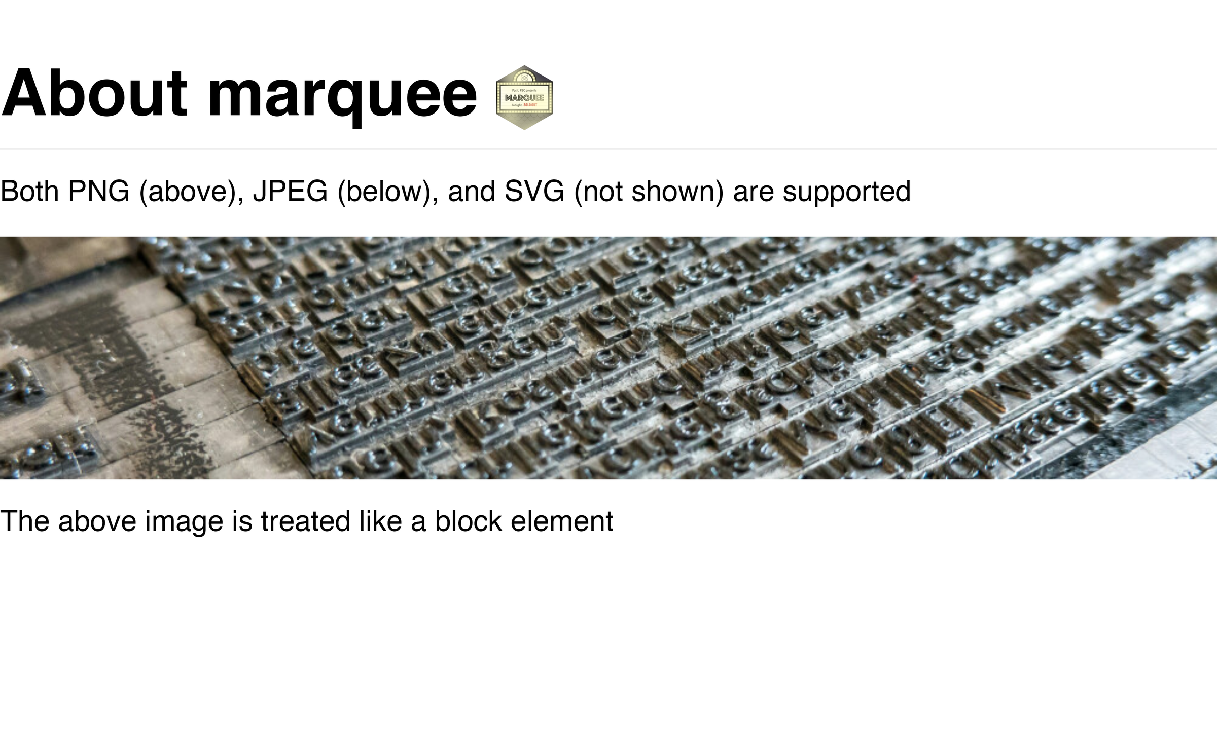 Markdown (famously) supports adding images through the  syntax. Since marquee supports the full CommonMark spec, this is of course also supported. The only limitation is that the “alt text” is ignored since hovering tool-tips or screen-readers are not supported for the output types that marquee renders to.