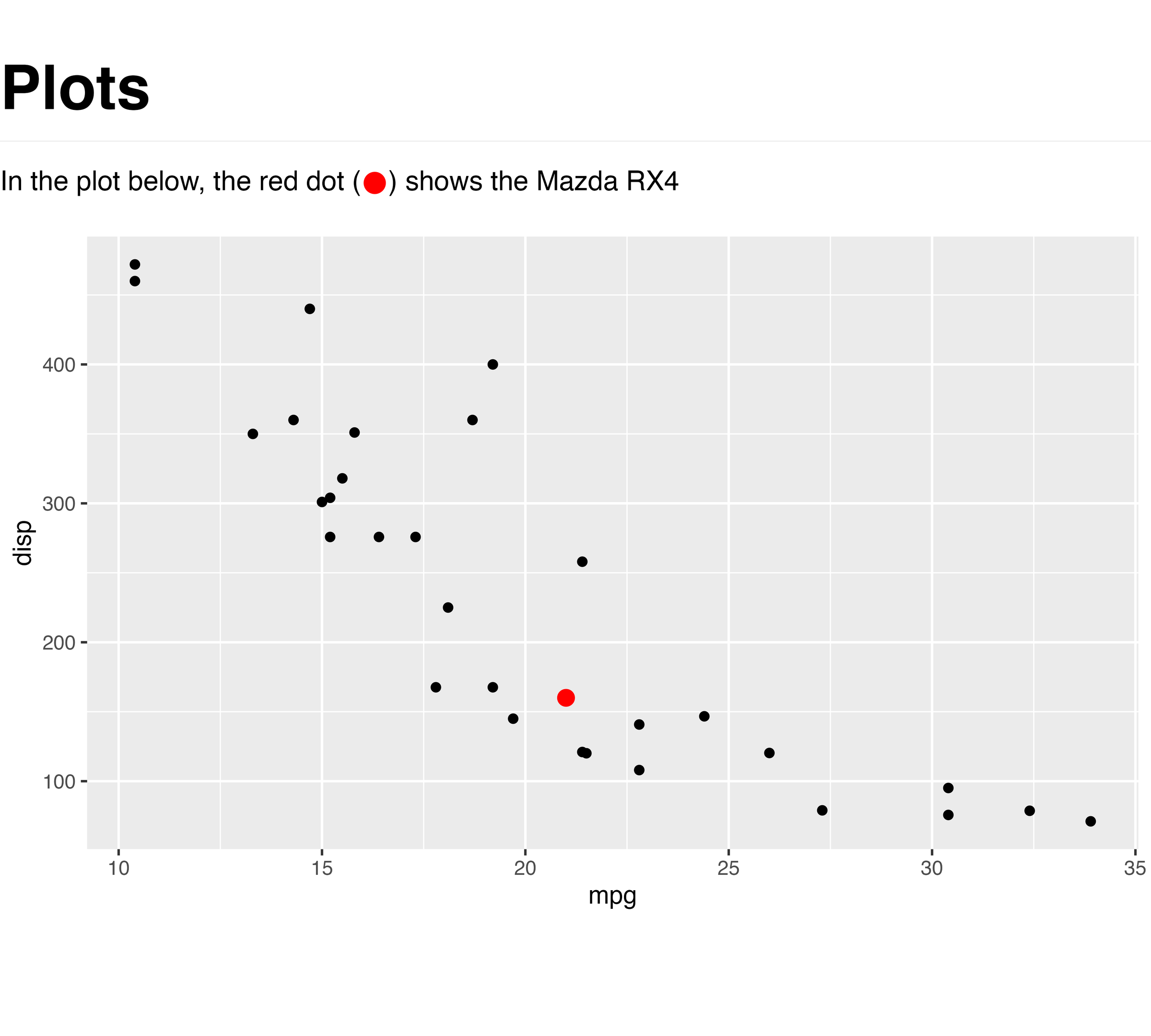 geom_point(aes(mpg, disp), mtcars[1,], colour = "red", size = 3)
