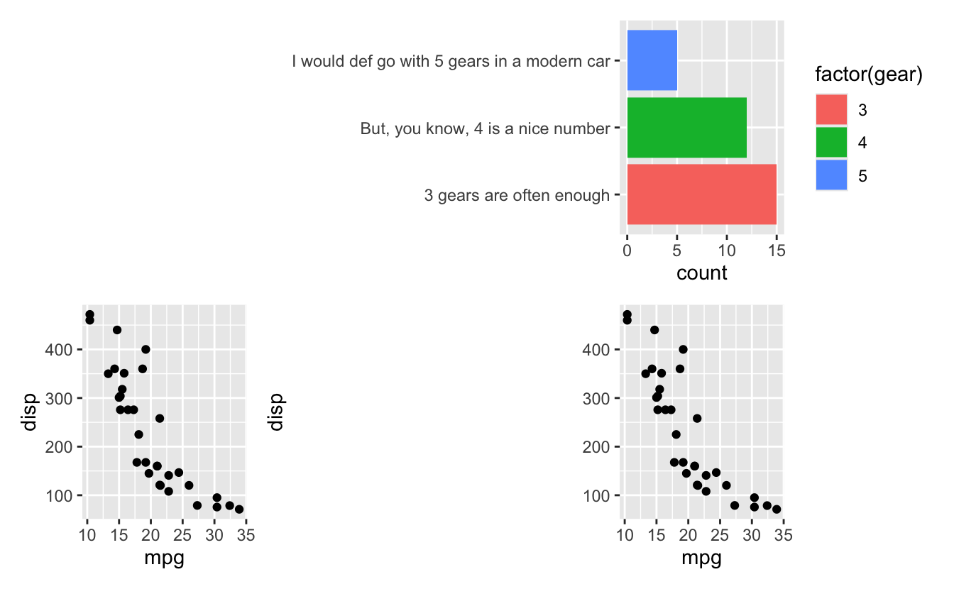 While being able to target specific sides is pretty great in and off itself, we are not done yet. After being able to not align panels the most requested feature was the possibility of moving the axis title closer to the axis text if alignment had pushed it apart. Consider again our unfreed patchwork: