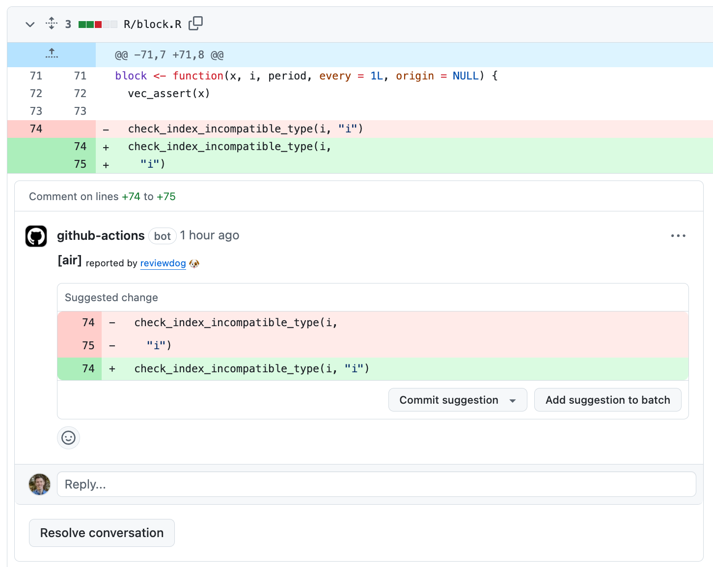 We like this workflow because it provides an easy way for external contributors who aren’t using Air to still abide by your formatting rules. The external contributor can even accept the suggestions themselves, so by the time you look at their pull request it’s already good to go from a formatting perspective ✅!