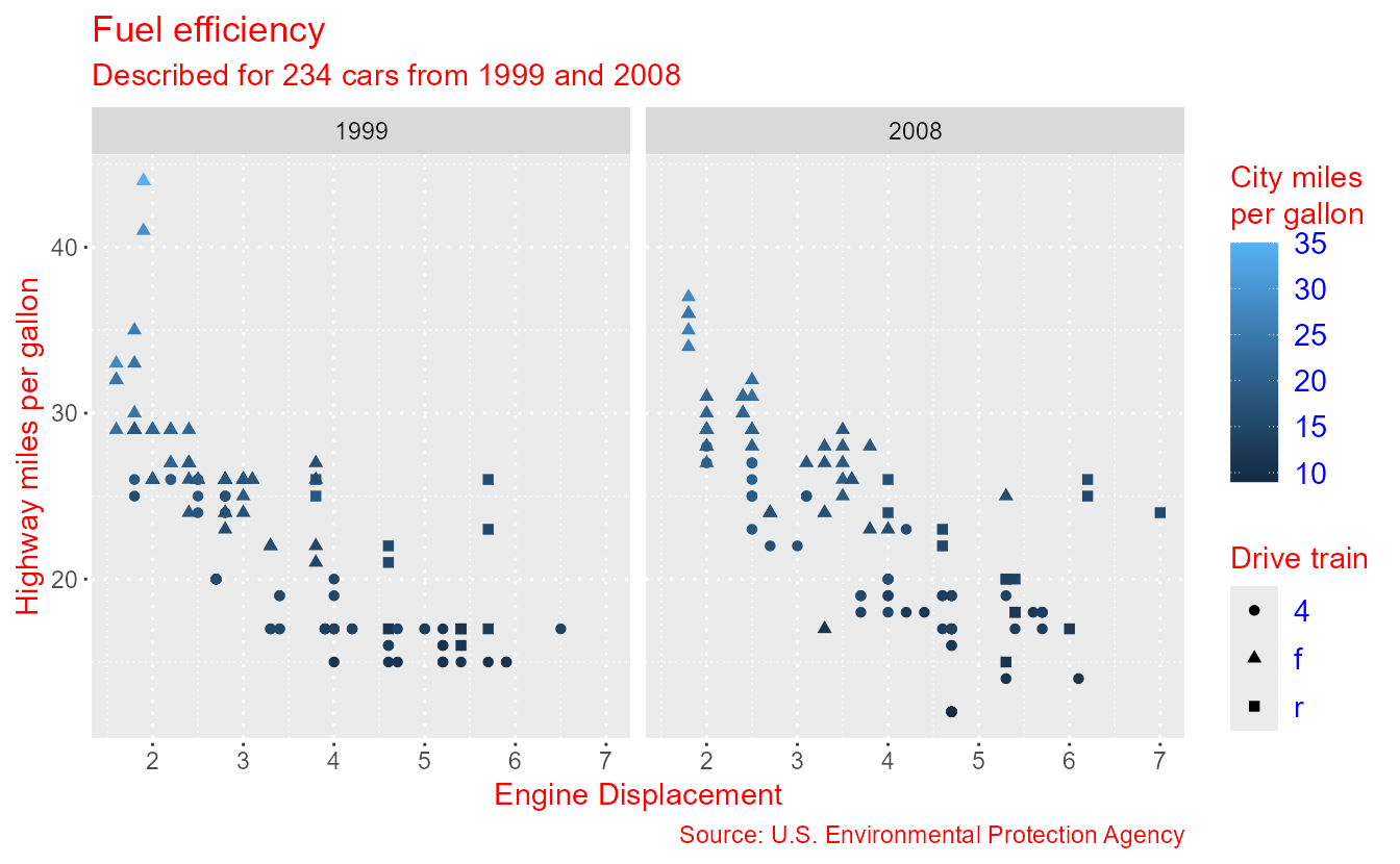 p <- ggplot(mpg, aes(displ, hwy, colour = cty, shape = drv)) +