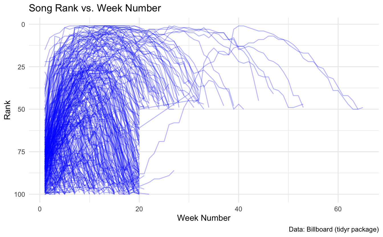billboarddataset is in wide format, with week columns (wk1,wk2, etc.). We usepivot_longer()to reshape it into a long format with week and rank columns.- Rank vs. Week Plot: Each song’s weekly rankings are connected with lines (