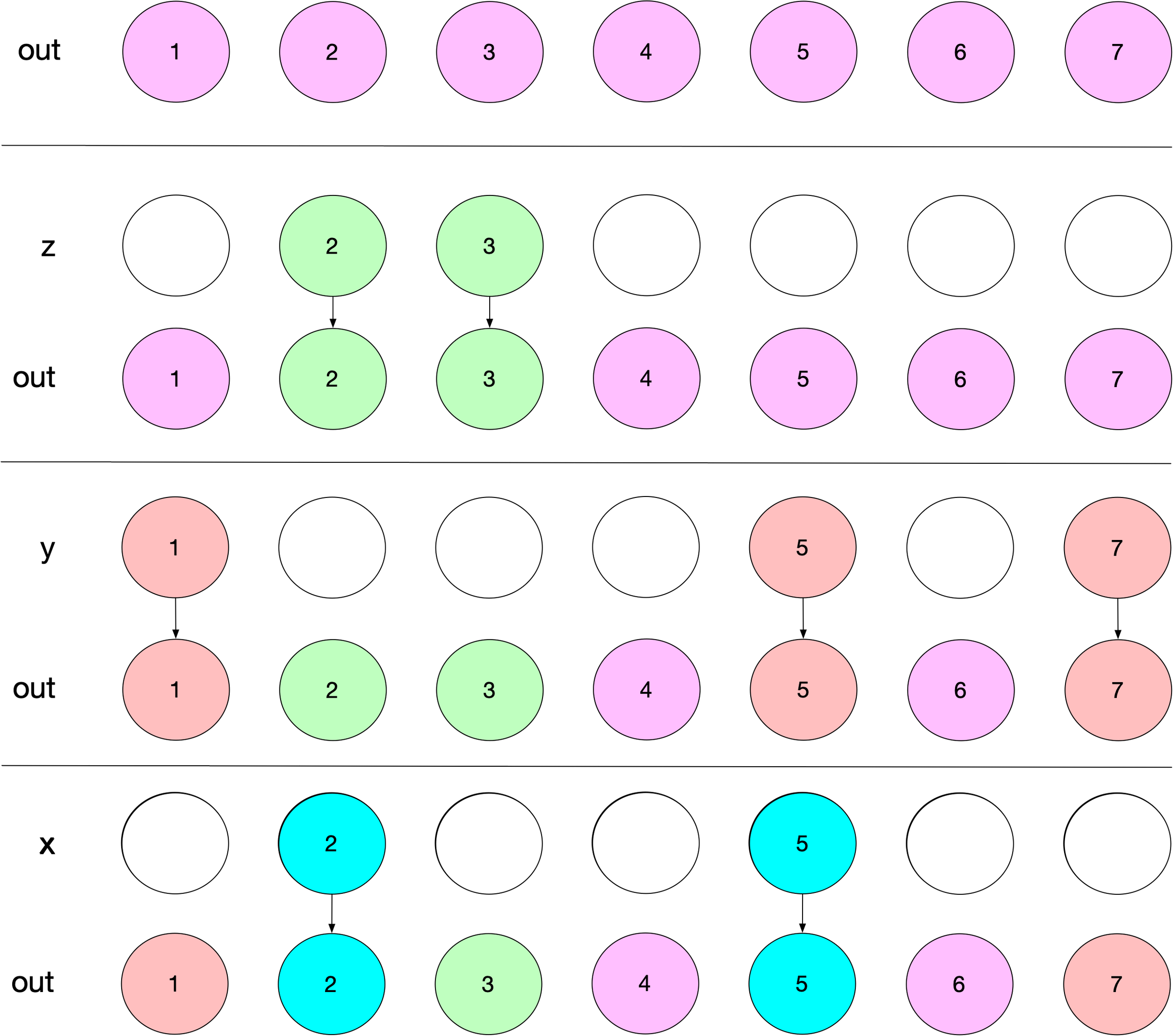 is handling places where x_condition and y_condition overlap. In the image, even though both x and y are selected at location 5, only the value of x is retained since it is hit “first”. This forces us to have to modify y_condition to avoid already “used” locations.
