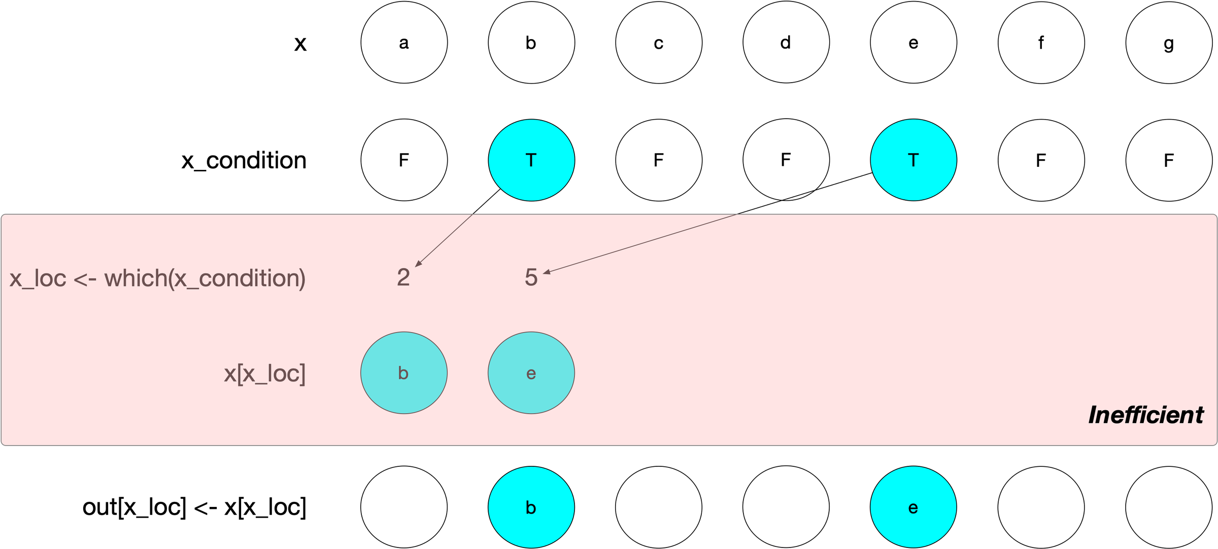 But vec_assign() still converts a logical x_condition to integer locations internally before doing the assignment. So now it doesn’t matter whether we do this conversion up front via which() or if we let vec_assign() do it, it still happens once per input. But we’d like to avoid it entirely!